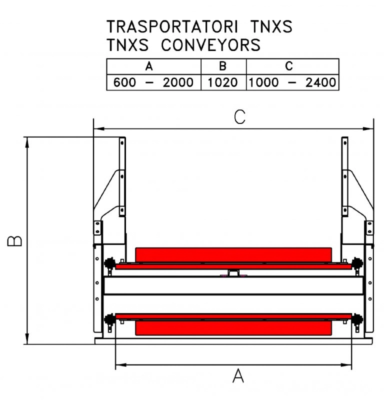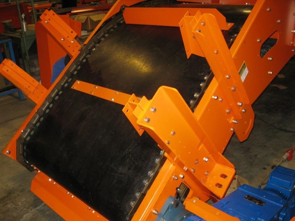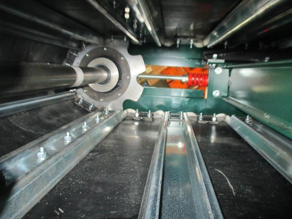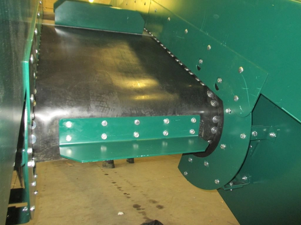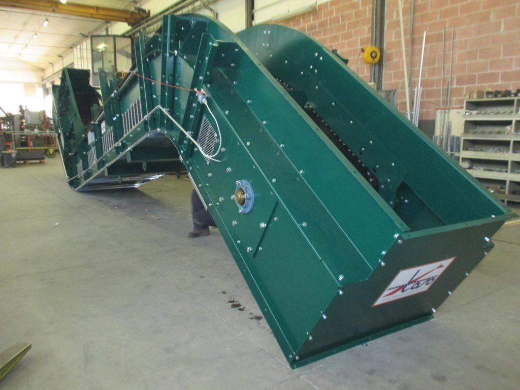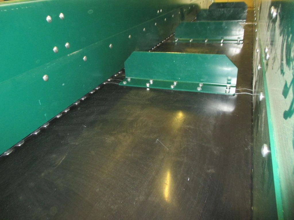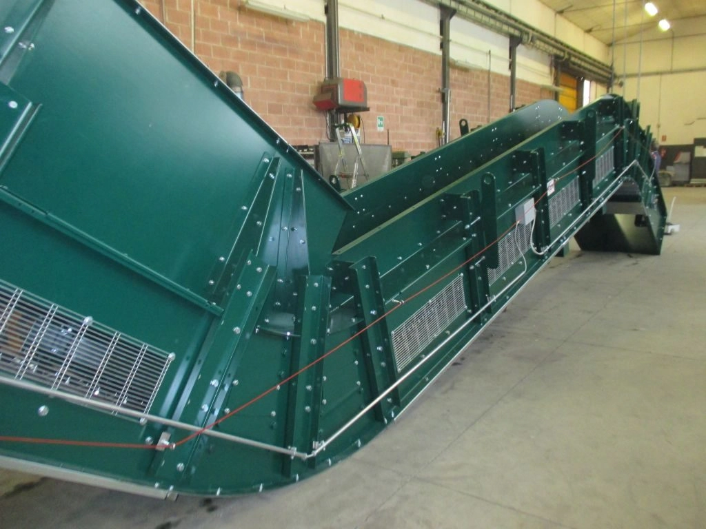 Due catene con sponda e rulli flangiati cementati passo 125/200mm carico di rottura da 16000 a 22400Kg/tot, tapparelle in acciaio montate ad un passo opportuno. Nastro in gomma Antiolio a 3 tele bullonato su catene e tapparelle per impedire impigli con le tapparelle e limitare le perdite di colaticci.