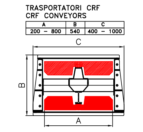 E’ costituita da ruote dentate eventualmente a settori munite di mozzo contenente cuscinetti a sfere ingrassabili dall’esterno, oppure montate su albero passante a mezzo di calettatori. La regolazione delle catene assistita da molle è prevista in funzione di un allungamento massimo delle stesse. Culatta curva di fondo idonea al recupero del prodotto ricircolato